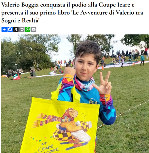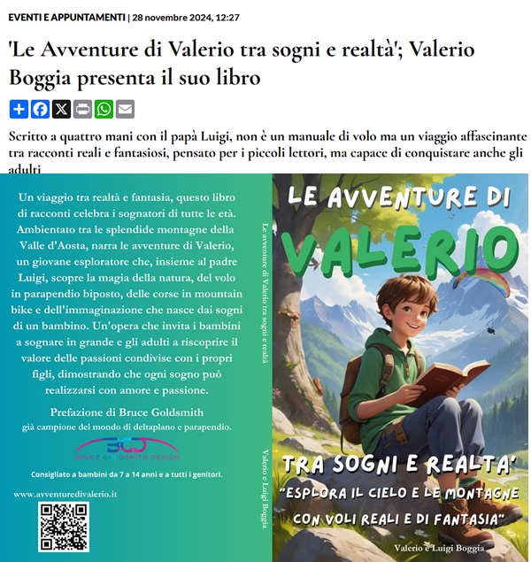 Sabato 30 novembre alle 17,30 la libreria BrivioDue in piazza Chanoux ad Aosta ospita la presentazione del libro 'Le Avventure di Valerio tra sogni e realtà'. Lo ha scritto a quattro mani con il papà Luigi il giovanissimo aostano Valerio Boggia, 10 anni e una passione avvincente per il volo.