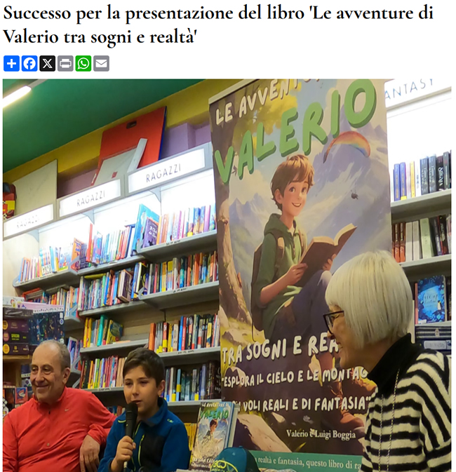 Si è svolta sabato 30 novembre, con una buona partecipazione di pubblico, la presentazione del libro 'Le avventure di Valerio tra sogni e realtà', scritto da Valerio Boggia, il giovane autore di soli 10 anni insieme a suo padre Luigi.